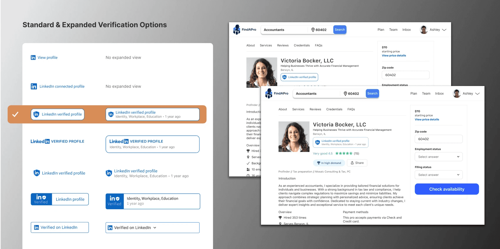 A subtle, credibility-first badge ("Verified on LinkedIn") that behaved like a safety signal, not an ad. Users trusted verification more when it felt protective, not promotional.